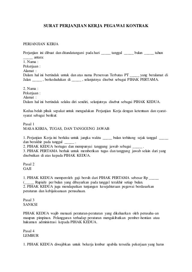 Surat kontrak kerja merupakan surat resmi yang di dalamnya berisi tentang perjanjian yang dilakukan oleh kedua pihak. Sehingga anda perlu memerhatikannya dengan teliti mengenai. Contoh surat kontrak kerja yang sering diterapkan di indonesia adalah perjanjian kerja waktu tertentu (pkwt) dan perjanjian kerja waktu tidak tertentu (pkwtt). Kontrak atau perjanjian kerja adalah kesepakatan dalam bentuk tertulis atau lisan yang dibuat untuk mengikat hubungan antara pekerja atau buruh dengan pengusaha, dalam periode waktu tertentu. Saat masuk bekerja di sebuah perusahaan pertama kali sebelumnya pasti anda menandatangani kontrak kerja.